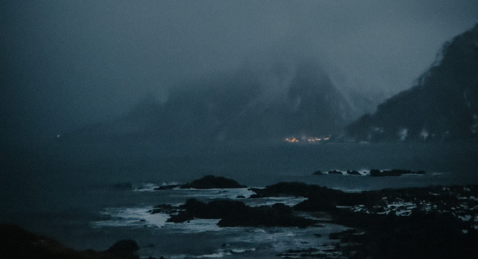 Widok na wewnętrzną ścianę wyspy Flakstad. U dołu osada Vikten. Jest godzina 1 w nocy, i właśnie w archipelag uderza największa fala wiatru, jaka jest przewidywana podczas