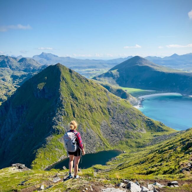 W miarę zdobywania wysokości krajobraz nabiera rozmachu – z jednej strony widzicie dziką, kamienistą Uttakleiv, z drugiej – idylliczną Haukland i otwarte morze, aż po horyzont. W słoneczne dni woda mieni się odcieniami błękitu i zieleni, a latem możesz liczyć nawet na złote światło północnego słońca o północy.