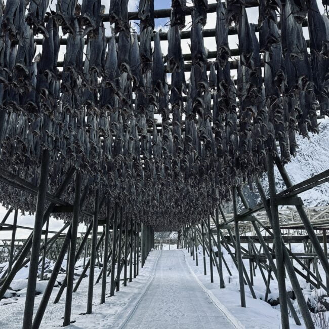 Ogólnie rzecz biorąc, suszone ryby możecie zobaczyć głównie w sezonie zimowym i wiosennym. Co to oznacza? Wiąże się to z połowem dorsza. Wszystko zależy od tego kiedy ten dorsz przypłynie na Lofoty, dlatego możecie spodziewać się ich widoku miedzy lutym a czerwcem.