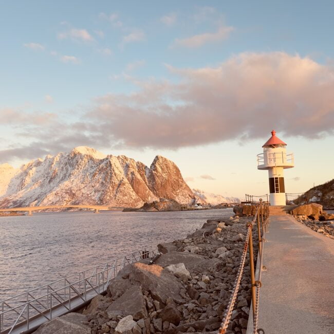 To miejsce ogólnodostępne. Możecie do niego dojść bezpośrednio z parkingu obok. Na latarnie można podejść, jednak jest zamknięta przed turystami. W okresie listopad – początek grudnia idealnie widać słońce wschodzące i zachodzące w niewielkiej odległości od siebie. Z latarni bardzo dobrze jest widać również całe Reine od strony drogi. Olstinden króluje nad fiordem. Dla mnie to istna magia. Bezwątpienia jest to jedno z takich miejsc, które nieczęsto widujecie w internecie.