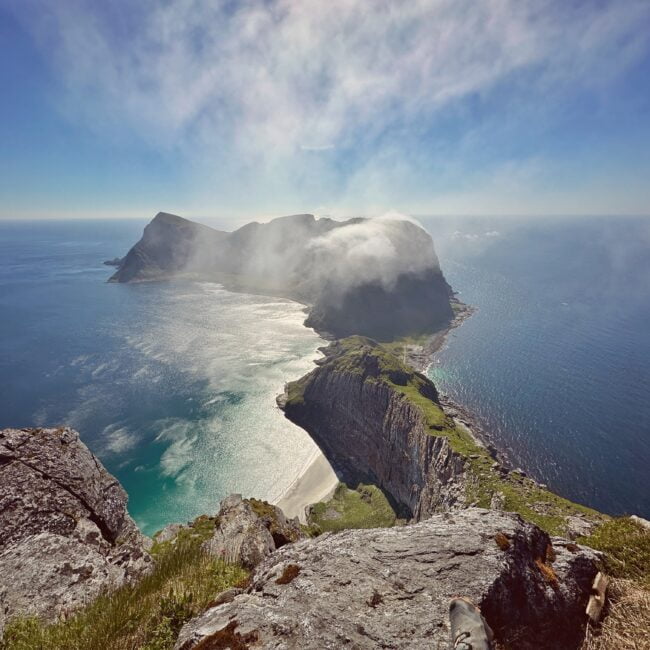 Przypływacie na wyspę i ja proponuje od razu uderzyć na szlak na Håheia. Z doświadczenia wiem, że szczyt często pokrywa się chmurami. Jeżeli zjeżdżając z promu zobaczycie, że szczyt jest odkryty, to nawet się nie zastanawiajcie. Parking jest oznaczony na mapie google, znajduje się dokładnie tutaj