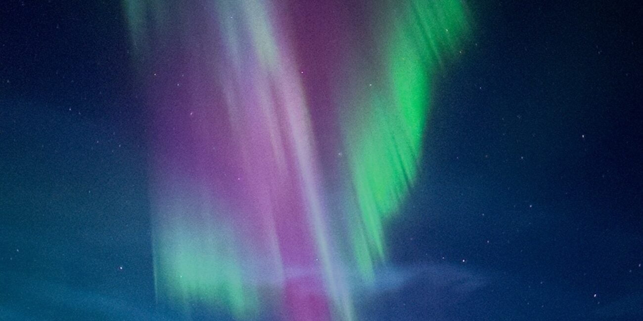 Niebieskie i fioletowe zorze, zwykle widoczne są na zdjęciach u dołu wyświetlacza.